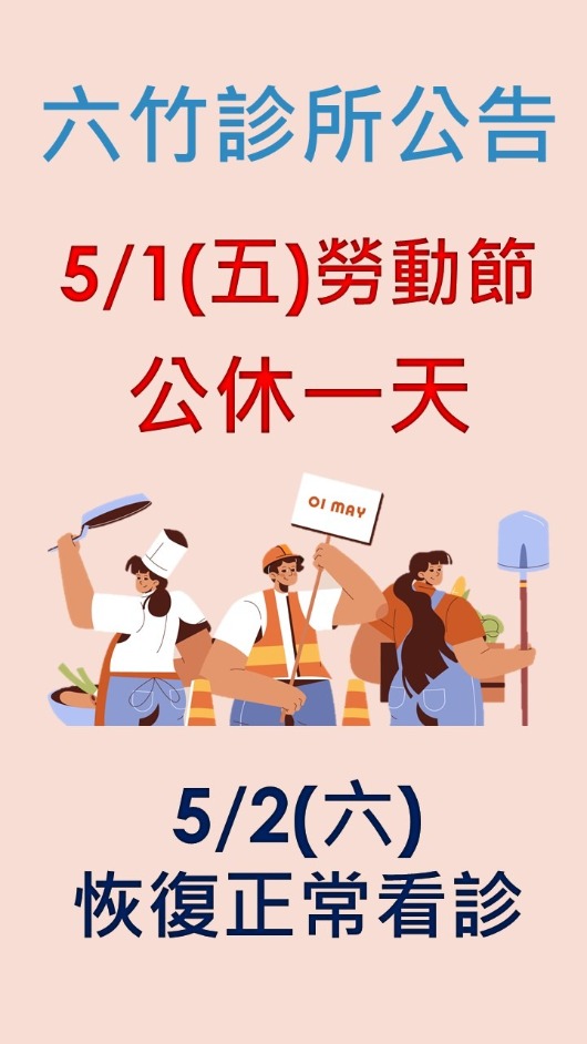 5/1(五)勞動節公休一天,5/2(六) 恢復正常看診